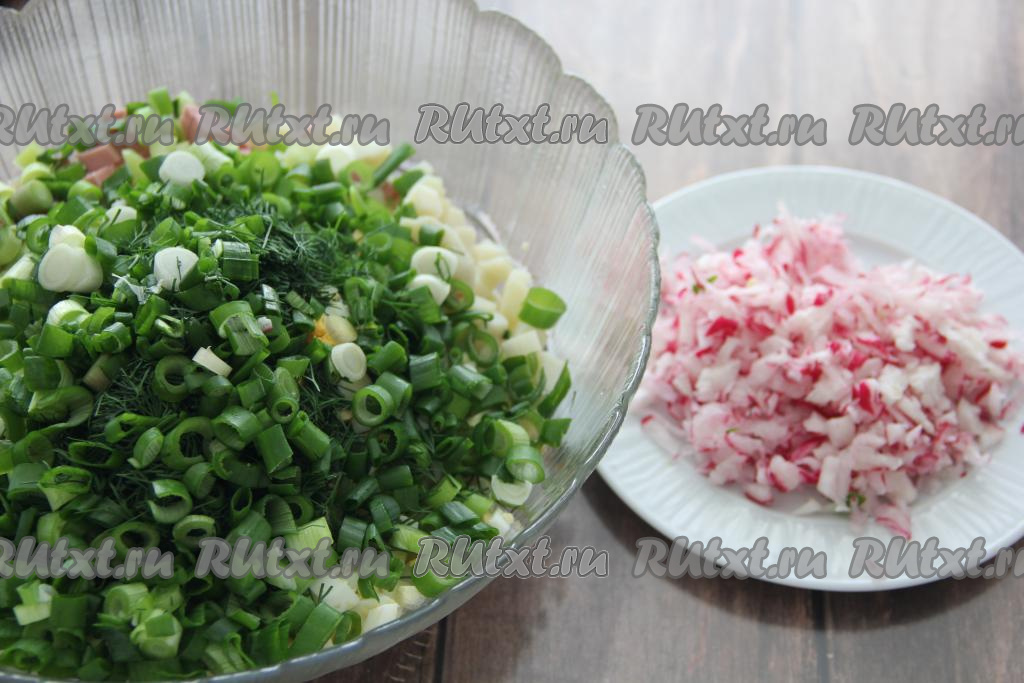 Подготовить продукты. Отварить яйца в течение минут 9-10 с момента закипания воды. Вымытые картошины отварить в кожуре до готовности (на это потребуется минут 25-30, время варки во многом зависит от сорта картофеля и от величины клубней). Варёные картошку и яйца остудить и очистить. Огурцы, болгарский перец, зелень и редиску вымыть. У редиса и огурчиков отрезать "кончики" с двух сторон. Удалить семенную коробочку из болгарского перца.
