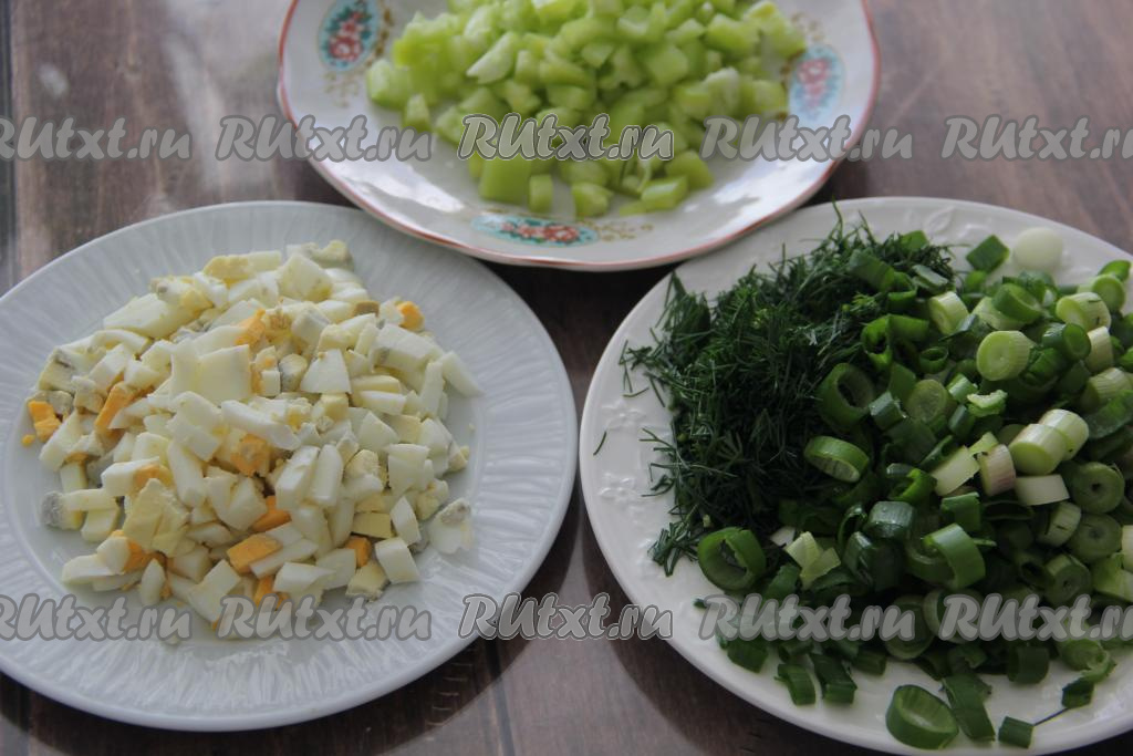Болгарский перец и яйца тоже нарезать на мелкие кубики. Нарезать мелко зелень.