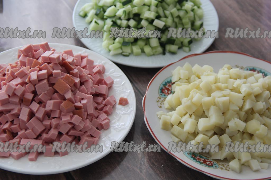 Картошку, огурцы и колбасу нарезать на мелкие кубики. Я стараюсь нарезать все составляющие для окрошки на примерно одинаковые по размеру небольшие кубики, тогда окрошка будет вкуснее.