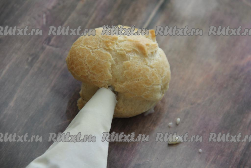 Готовый заварной крем переложить в кулинарный мешок. Наполнить остывшие профитроли кремом.