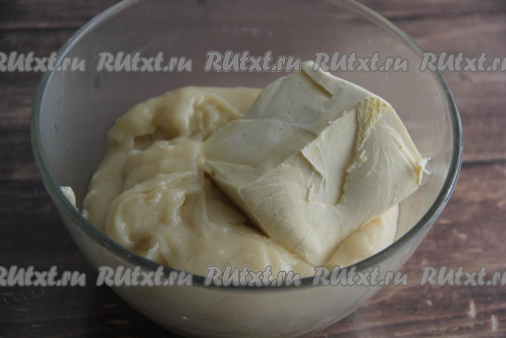 В горячий крем выложить сливочное масло комнатной температуры и перемешать до растворения масла (до однородности). Накрыть получившийся крем пищевой плёнкой так, чтобы плёнка лежала на поверхности крема (благодаря соприкасанию плёнки с кремом, на поверхности крема не будет образовываться корочка), оставить до полного остывания, а затем можно поставить в холодильник.