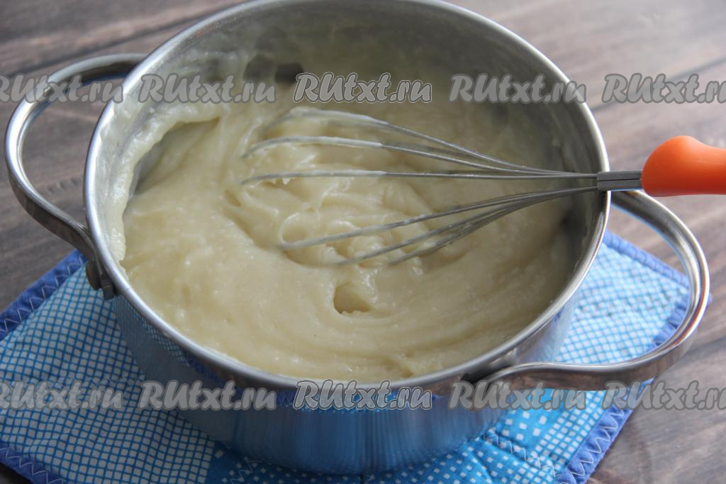 Кастрюлю поставить на средний огонь и, не переставая перемешивать венчиком, довести крем до кипения, а затем проварить до загустения (на это потребуется минуты 3), помешивая. Снять загустевший заварной крем с огня.