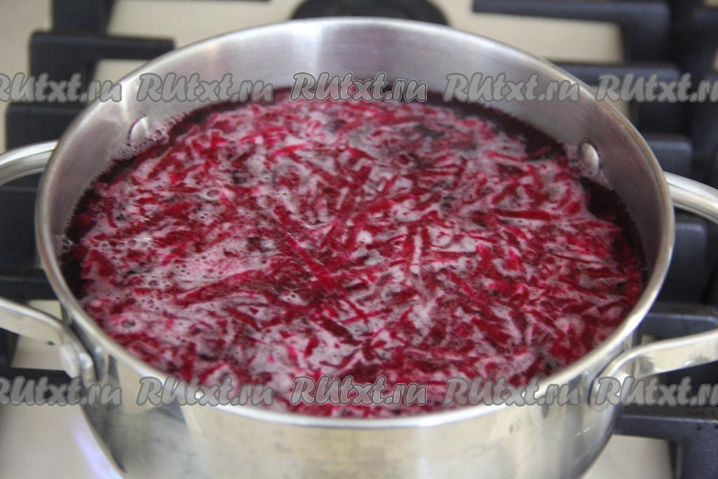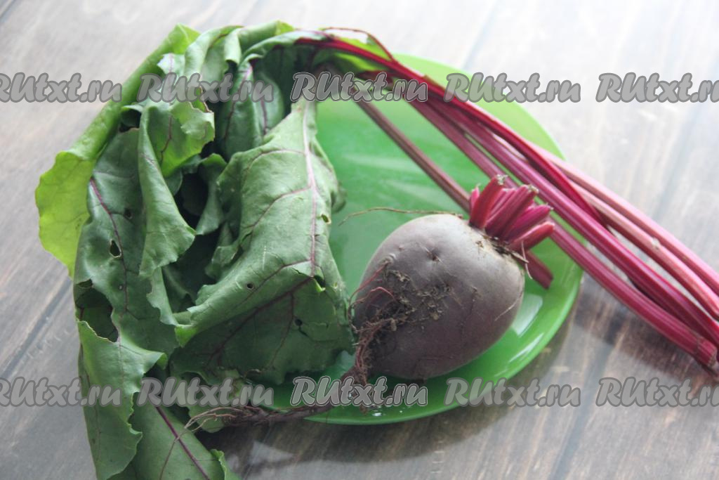 В кастрюлю влить 1,5 литра воды и поставить на огонь. Свеклу почистить и натереть на крупной тёрке. Свекольную ботву помыть под водой, испорченные листочки удалить, затем нарезать на полоски шириной, примерно, 1,5 сантиметра. После того как вода в кастрюле закипит, выложить в кипящую воду натёртую свеклу и варить с момента закипания 5 минут на умеренном огне.