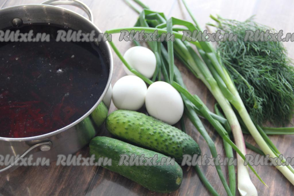 Готовую смесь овощей и яиц разложить по тарелкам. Добавить в каждую тарелку по 2 половника холодного свекольного бульона. Можно в тарелку добавить сметанку или майонез. Кто любит супы с остринкой, можно добавить пару капель 9% уксуса.