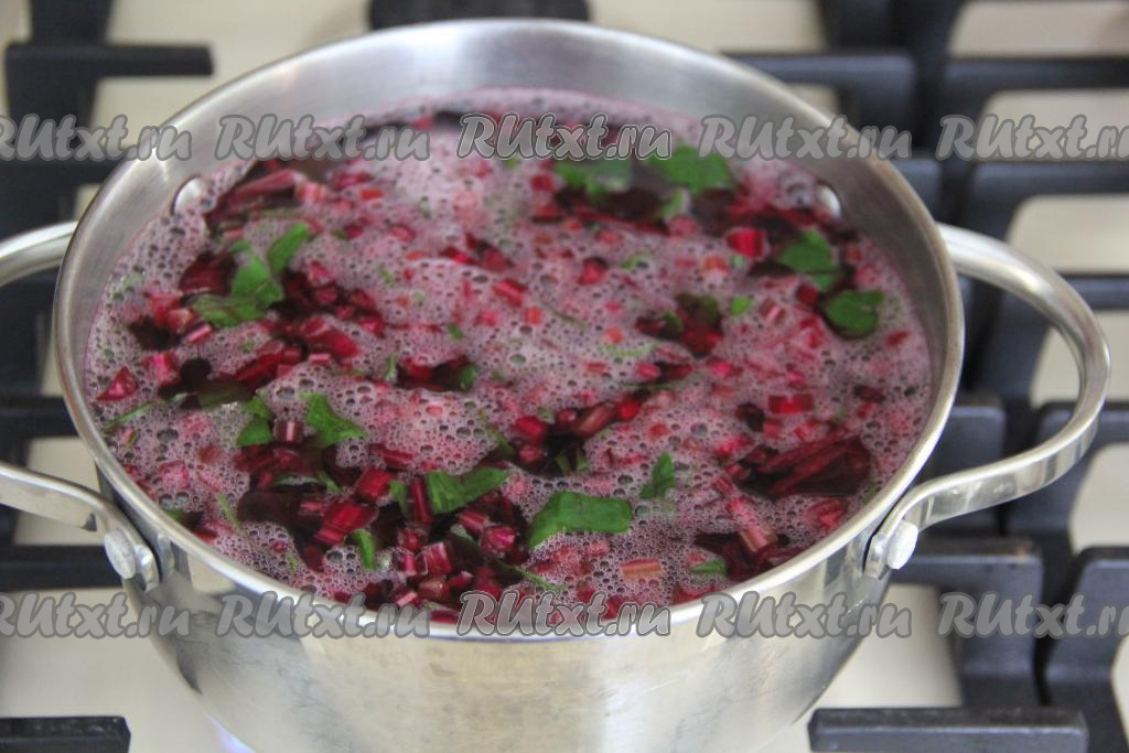 Затем добавить нарезанную ботву, дать закипеть и варить минуты 2-3. Снять кастрюлю с овощным бульоном с огня, дать остыть до комнатной температуры, а потом переставить кастрюлю в холодильник на пару часов (бульон должен хорошо охладиться).