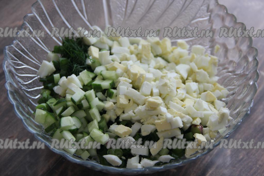 Яйца и огурцы нарезать на мелкие кубики. Зелень мелко нарезать.