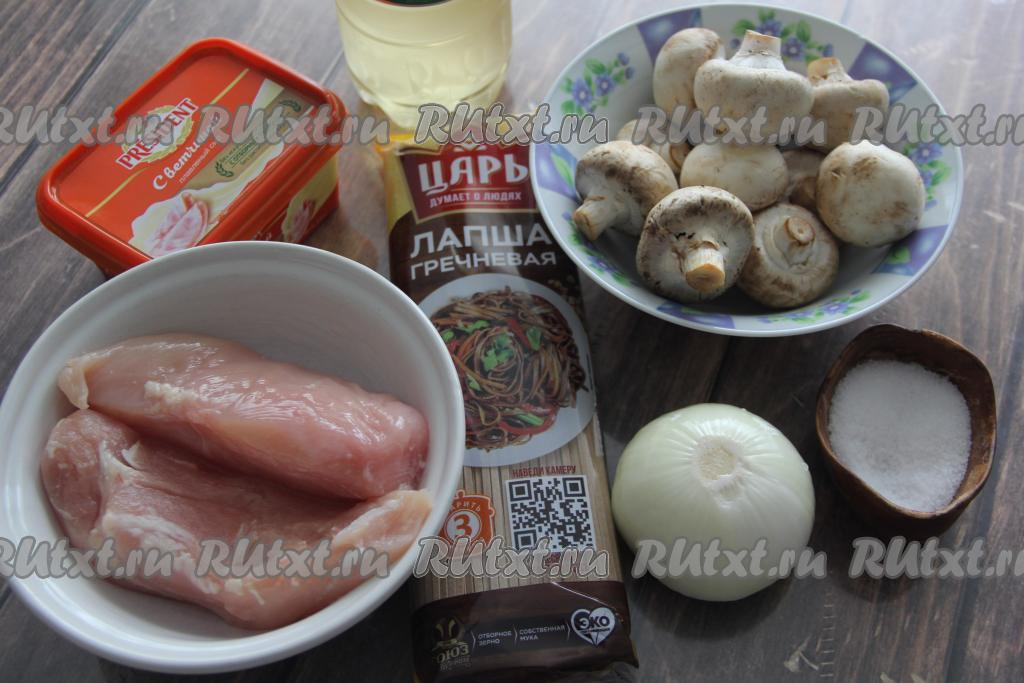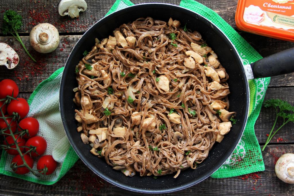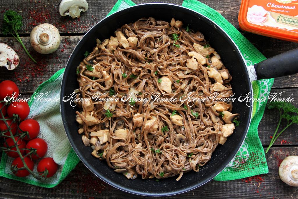 С гречневой лапшой можно сделать немало отличных блюд. В этот раз предлагаю приготовить гречневую лапшу в сочетании с курицей и грибами. Блюдо получается очень вкусным и сытным. Гречневую лапшу можно купить во многих продовольственных магазинах в разделе азиатской кухни. Готовить будем на сковороде с высокими бортиками, а лапшу предварительно отварим в кастрюле. Из грибов я взяла свежие шампиньоны, можно также взять вешенки. Всем советую приготовить гречневую лапшу по этому рецепту!