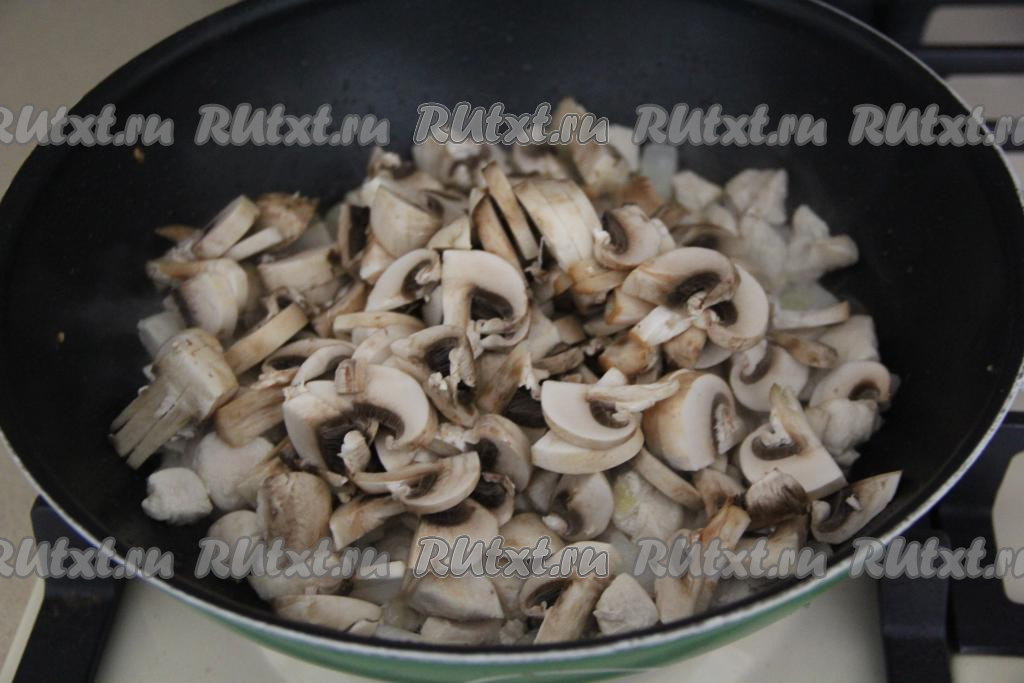 Шампиньоны нарезать на пластинки и добавить в сковороду.