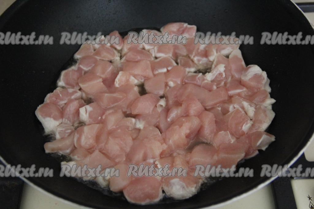 В сковороду влить растительное масло, разогреть. Нарезать куриное филе на небольшие кусочки и выложить в сковороду.