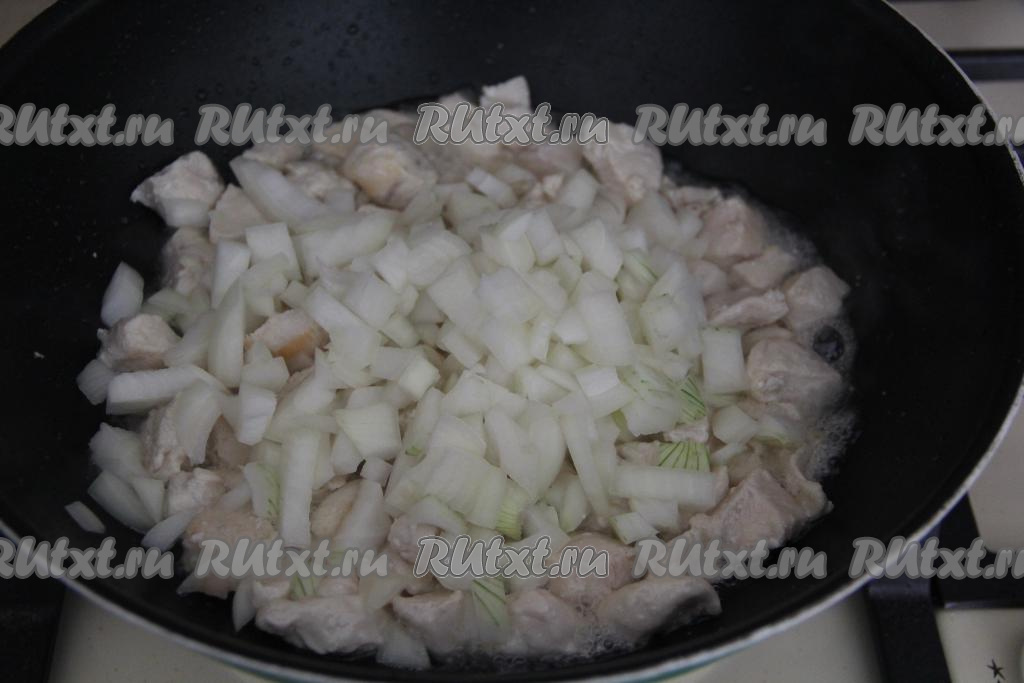 Обжарить кусочки курочки в течение 10 минут, помешивая периодически, на среднем огне. Затем добавить нарезанный лук. Жарить ещё минут 5, иногда помешивая.
