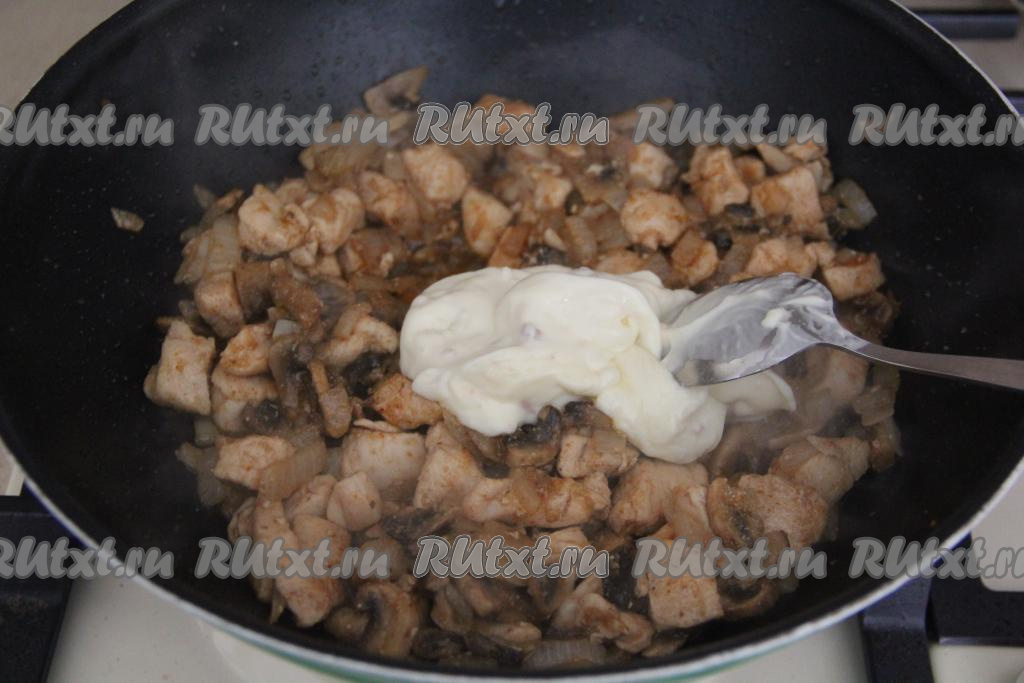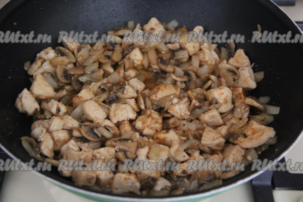 Обжаривать грибы с курицей и луком, иногда помешивая, в течение 10 минут.
