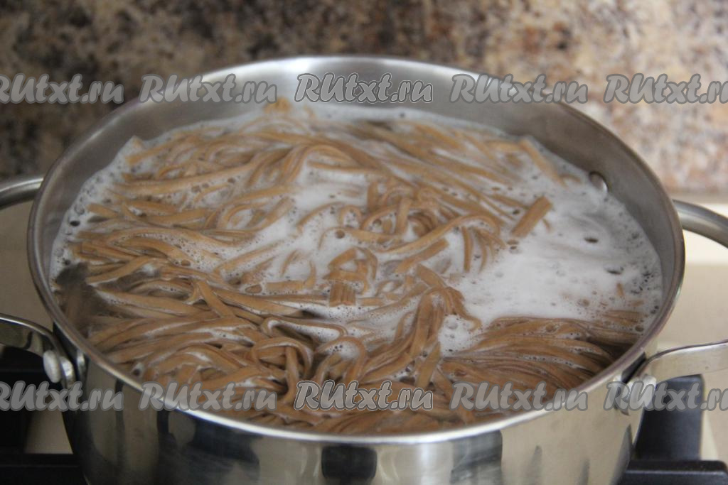 В кастрюлю налить воду, поставить на сильный огонь, после закипания посолить и опустить в неё гречневую лапшу, дать закипеть и уменьшить огонь. Варить лапшу 3 минуты (гречневая лапша бывает разной, поэтому точное время варки смотрите на упаковке вашей лапши).