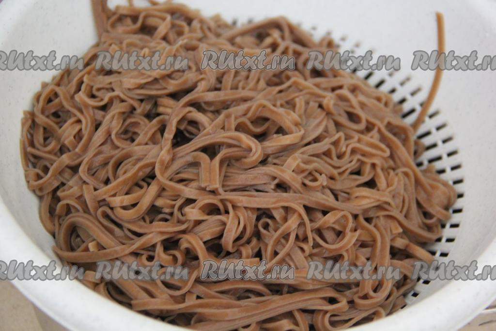 Откинуть лапшу на дуршлаг, промыть её холодной водой. Оставить в дуршлаге на несколько минут, чтобы стекла вода.