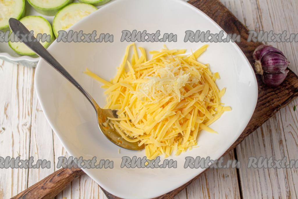Подготовьте начинку для кабачков, для этого сыр, натёртый на средней тёрке, выложите в миску, добавьте натёртые на мелкой тёрке (или пропущенные через пресс) зубчики чеснока.