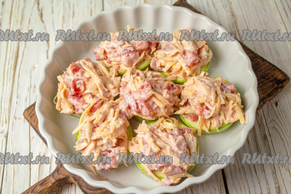 В качестве тёплой закуски к обеду или ужину можно приготовить в духовке аппетитные кружочки кабачков, запечённые под сочной, ароматной начинкой из помидоров и сыра. Блюдо неизменно получается очень вкусным. При желании, с рецептом можно экспериментировать, например, добавить в начинку, свежую зелень, болгарский перец или шампиньоны. Приготовьте это простое блюдо и насладитесь его вкусом и ароматом!