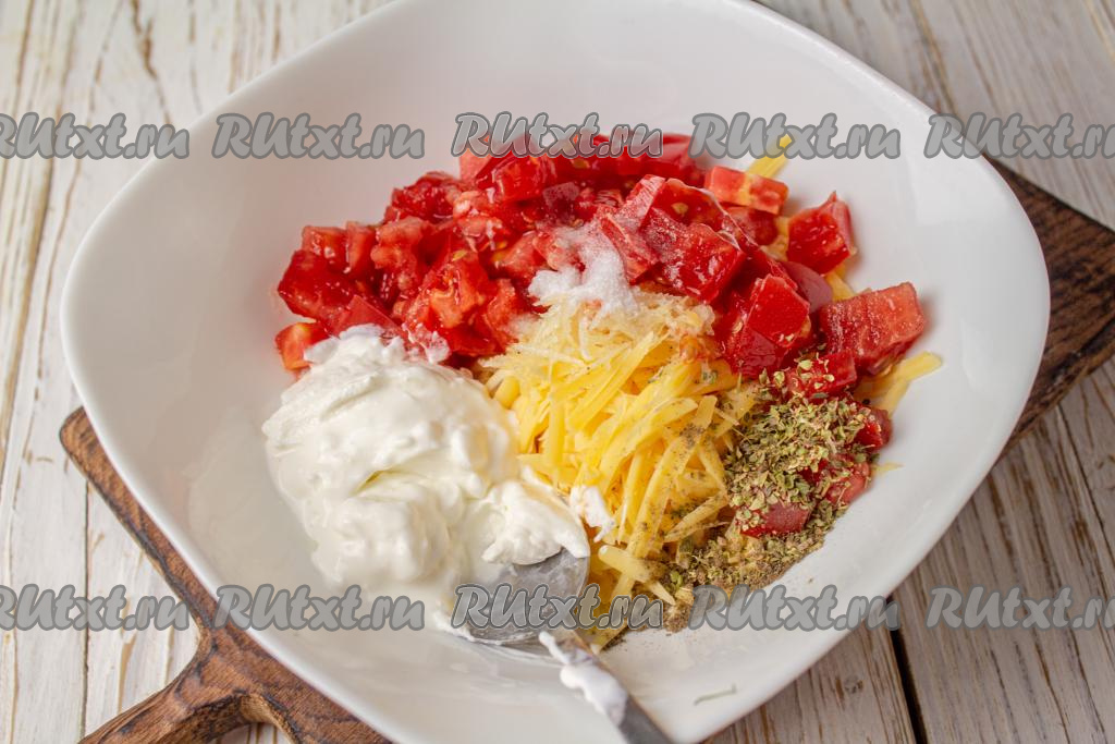 К сыру с чесноком добавьте помидор, нарезанный на небольшие кубики, сметану (или майонез), чёрный молотый перец, сушёный орегано и соль, перемешайте и начинка для кабачков готова.