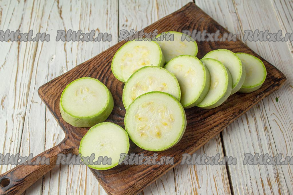 Зубчики чеснока очистите. Помидор вымойте. Для этого блюда нужно брать молодой кабачок с мелкими семечками (если кожица у кабачка жестковата, тогда лучше её срезать). Нарежьте кабачок на кружочки толщиной 1,5-2 сантиметра. Выложите кабачки в один слой в форму для запекания (или на противень).