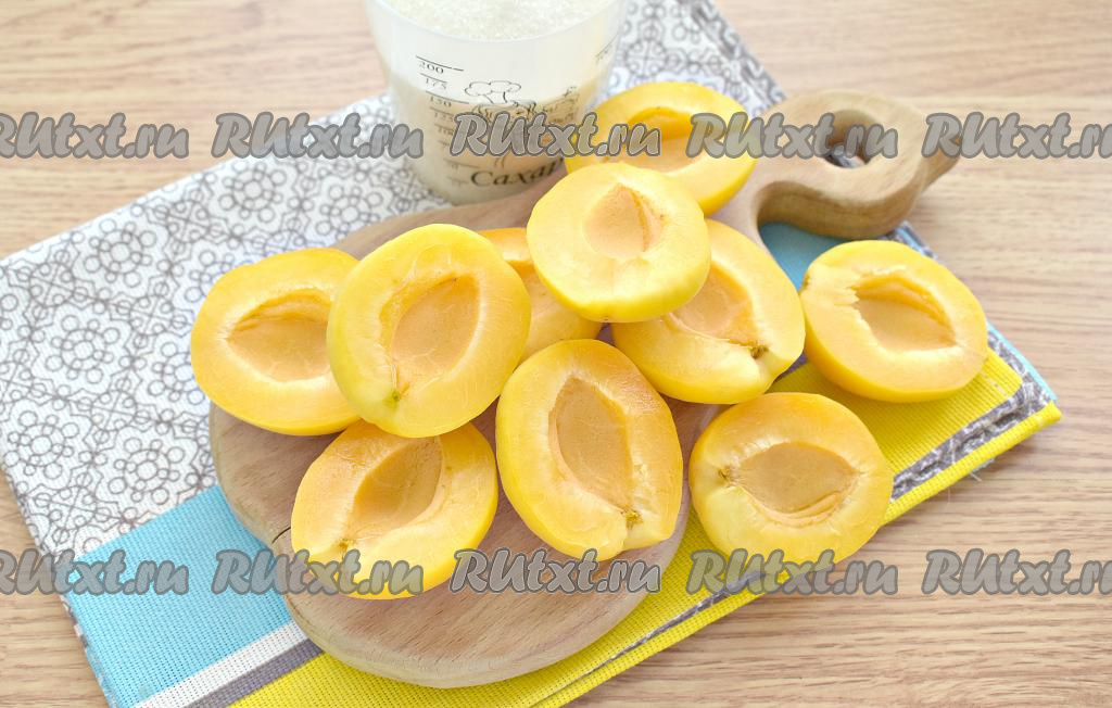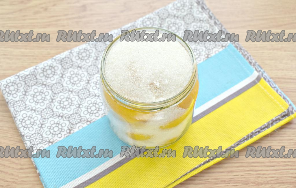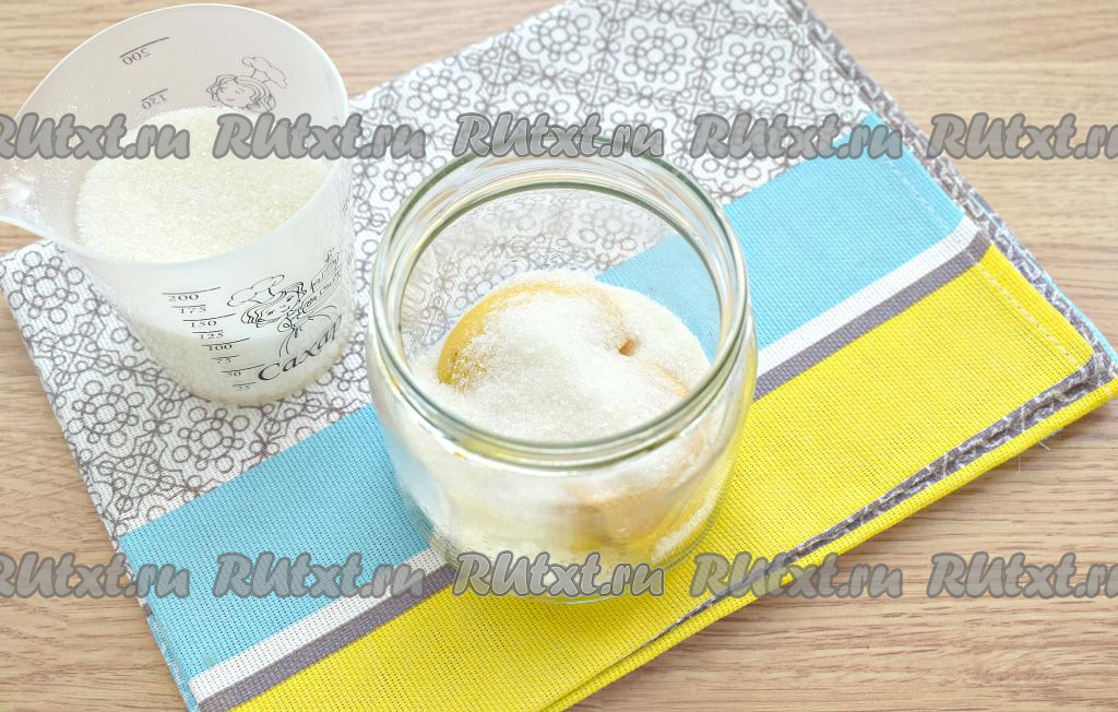 Выкладываем половинки абрикосов в банки (я раскладывала по двум банкам объёмом 350 миллилитров), пересыпая слои фруктов сахаром.