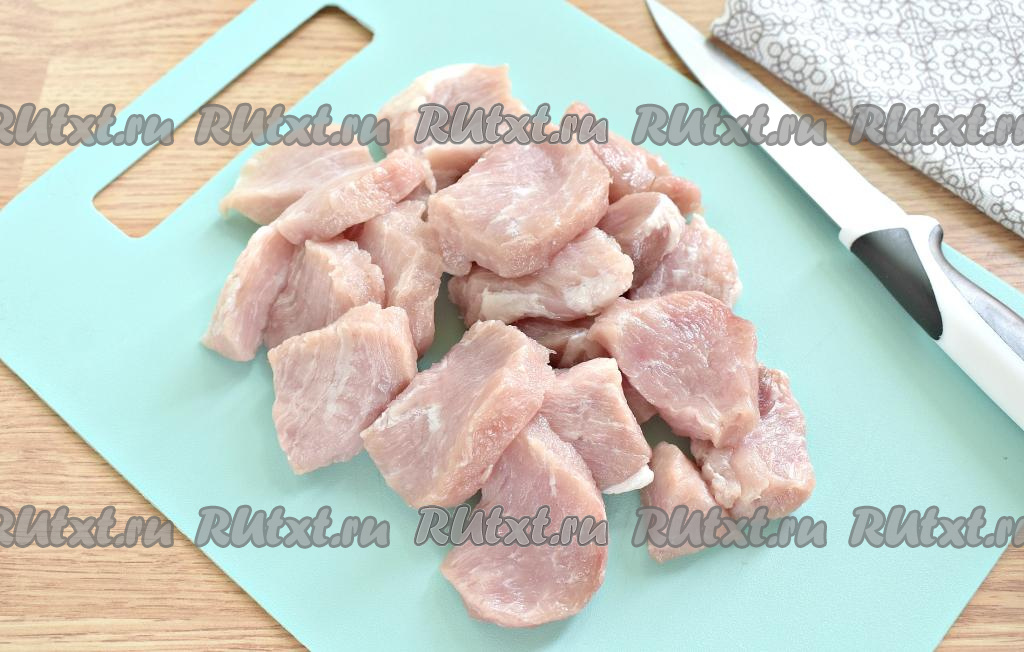 Свинину промываем водой, обсушиваем и нарезаем на небольшие порционные кусочки толщиной около 1 сантиметра.