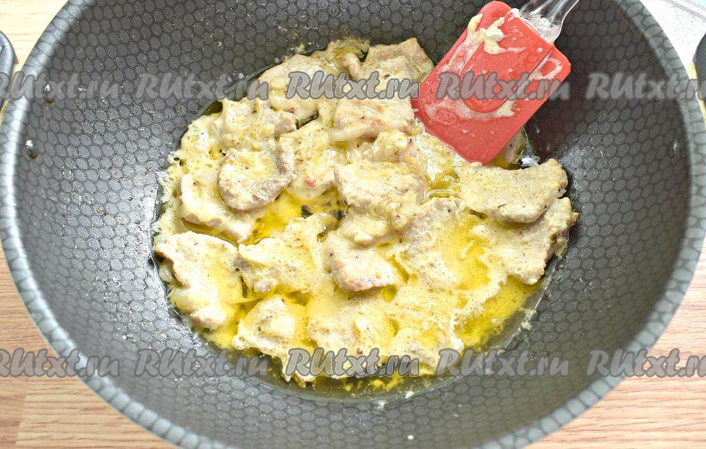 Дно сковороды смазываем растительным маслом. Выкладываем в один слой отбитые кусочки свинины.