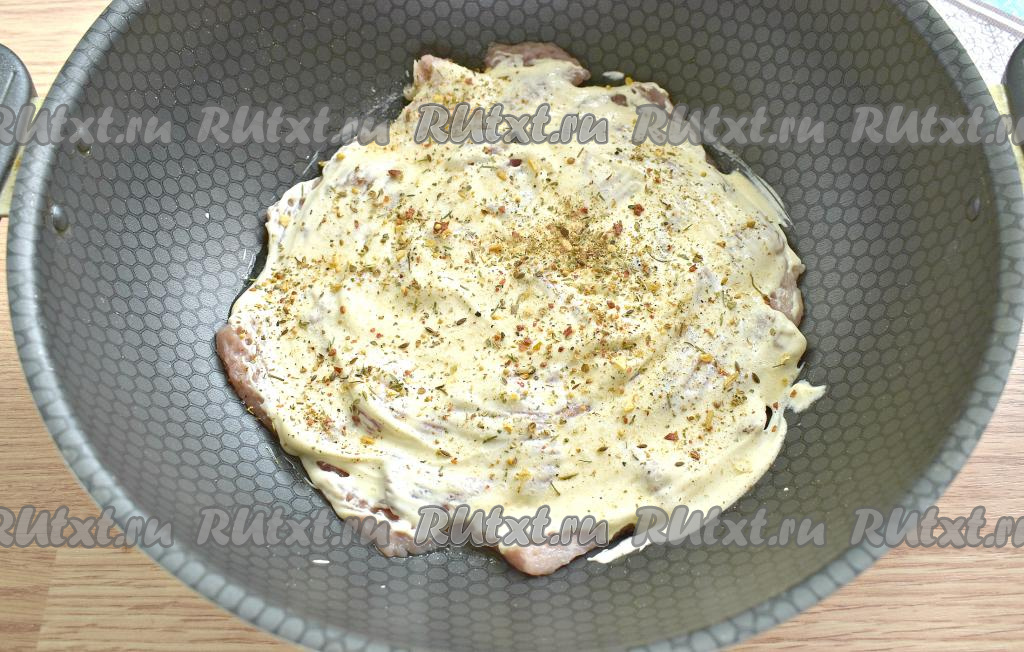 Сверху кусочки свинины обильно смазываем майонезом.
