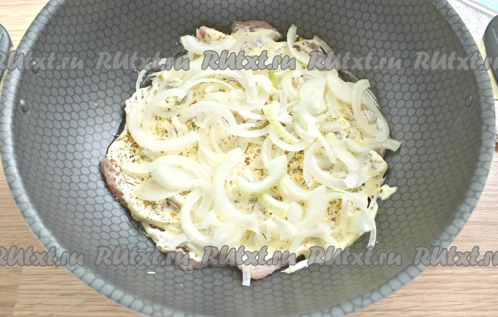 Репчатый лук очищаем, нарезаем полукольцами, равномерно раскладываем поверх свинины, смазанной майонезом.