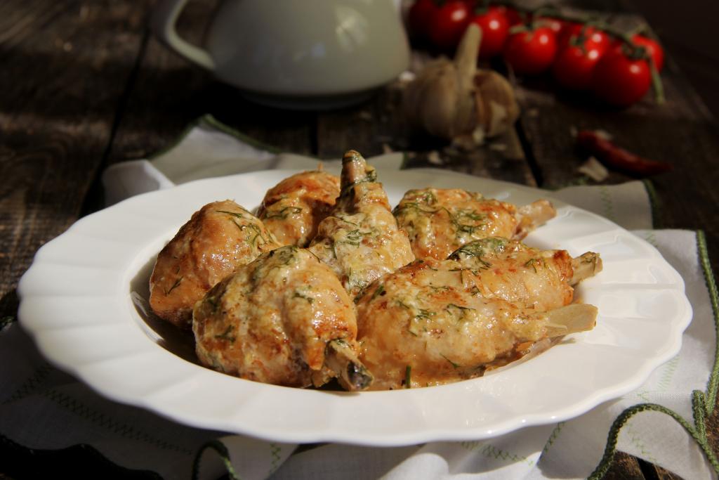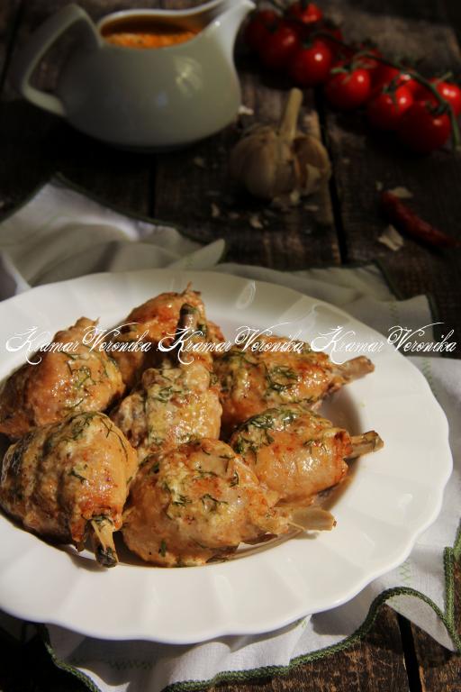 Подготовить продукты. Для этого блюда можно взять тушку курицы и разрезать на порционные кусочки, а можно использовать определённые части куриного мяса (например, ножки, бёдра, крылышки). Части курицы промыть, обсушить. Я взяла куриные ножки, предварительно сняла с них кожу.