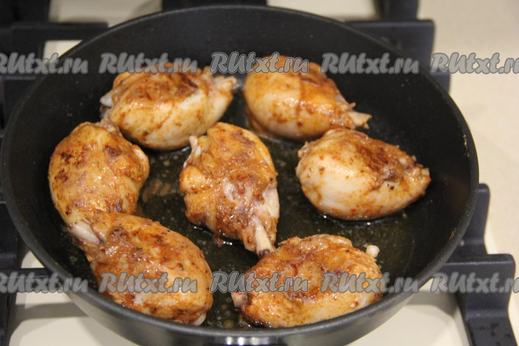 Обжарить курицу с двух сторон до золотистого цвета на достаточно сильном огне (на это потребуется минут 5-7).