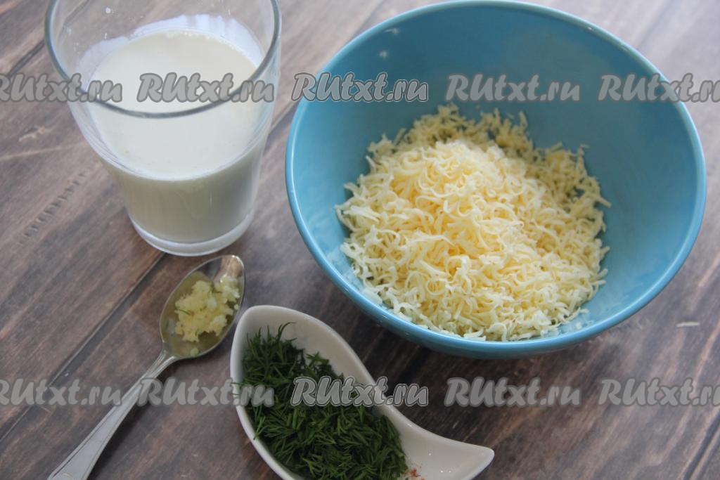 Для приготовления сливочно-сырного соуса нужно натереть на мелкой тёрке сыр. Чеснок почистить и пропустить через пресс. Зелень вымыть, обсушить и мелко нарезать. Сливки можно взять любой жирности.