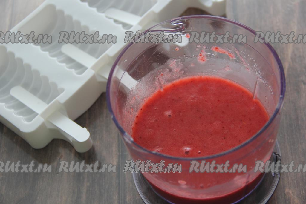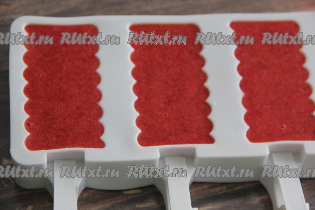 В форму для мороженого вставить палочки. Я использовала силиконовую форму, купленную на Ozon. Разлить клубничную массу по формочкам (у меня получилось 3 формочки) и отправить в морозилку до полного застывания.
