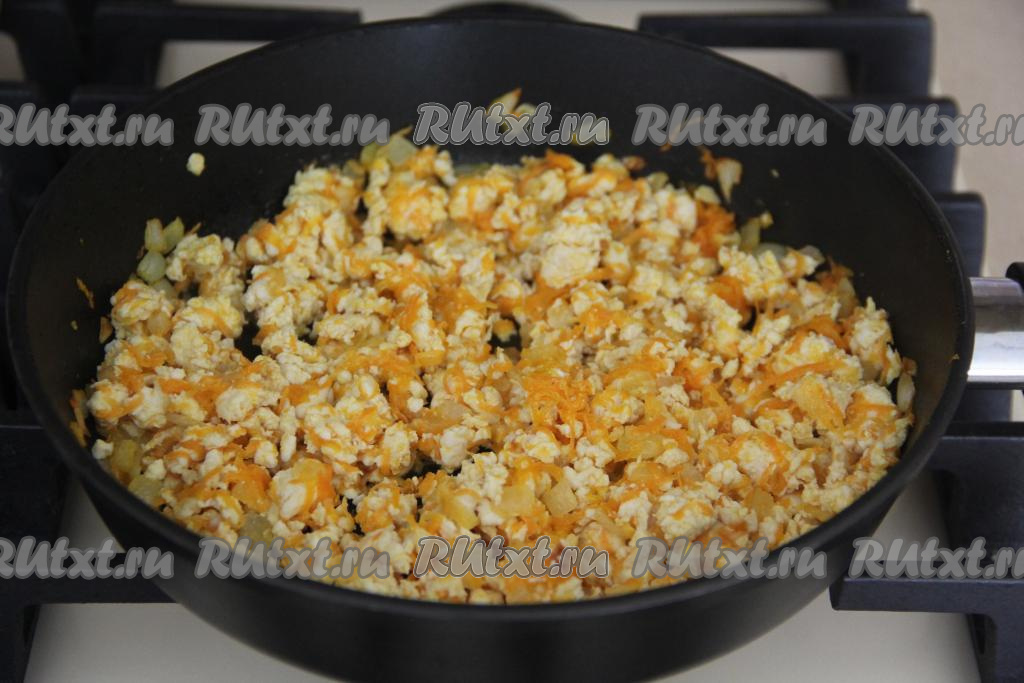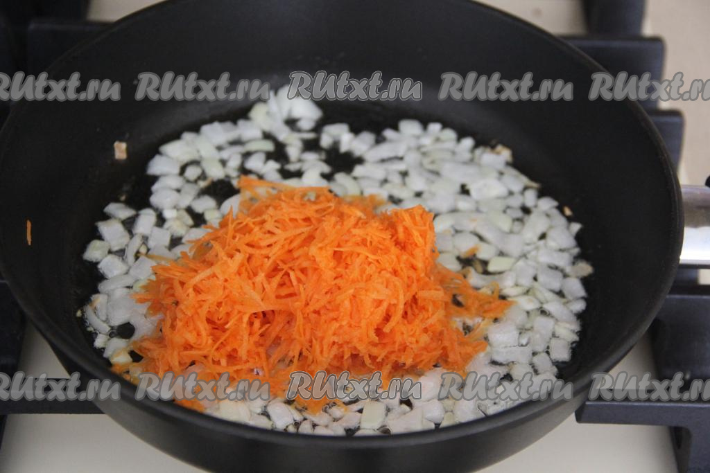 К обжаренному луку выложить морковку, натёртую на мелкой тёрке, обжаривать овощи минуты 2-3, периодически помешивая.