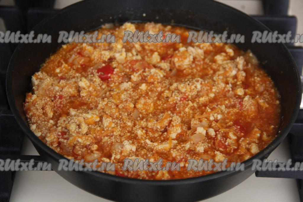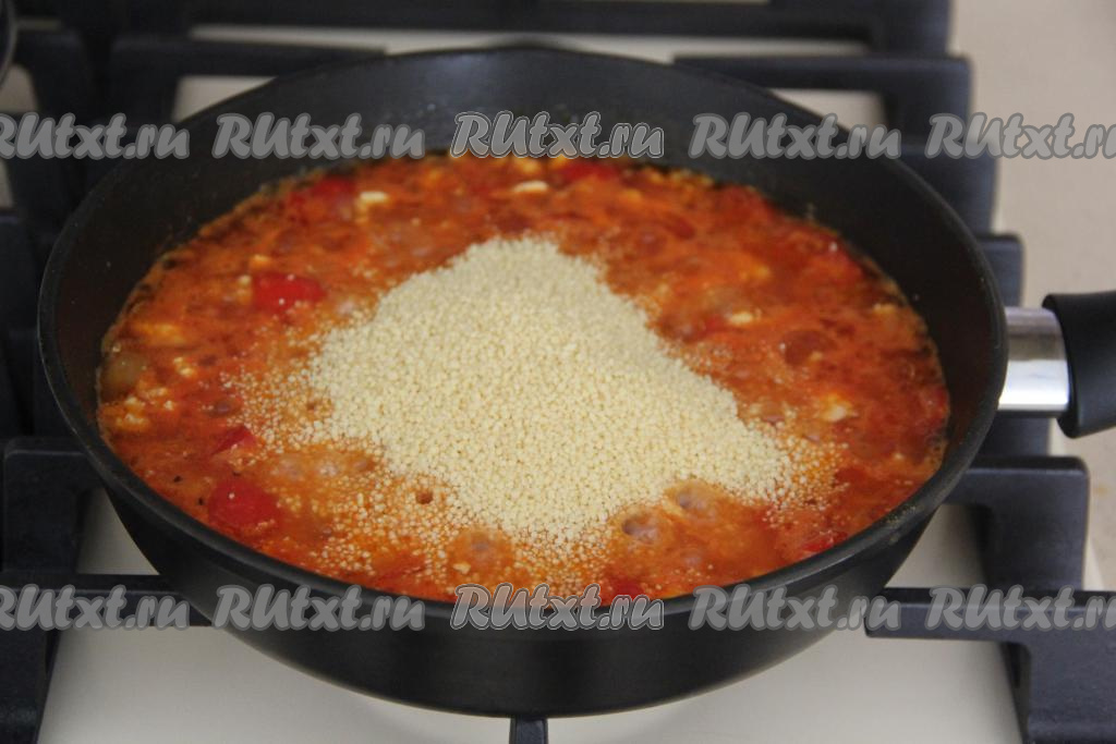 Всыпать кус-кус в сковороду с фаршем.