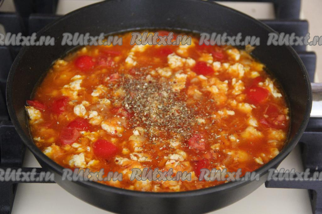 Перемешать, накрыть сковороду крышкой и снять с огня. Дать настояться 7 минут.