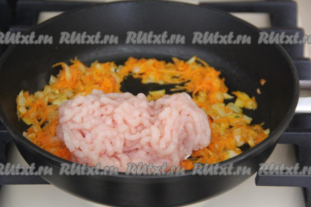 К обжаренным овощам выложить фарш.