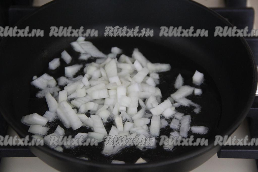В сковороду с высокими бортиками влить масло, немного прогреть его, выложить мелко нарезанный лук и обжаривать его минуты 3, иногда помешивая.