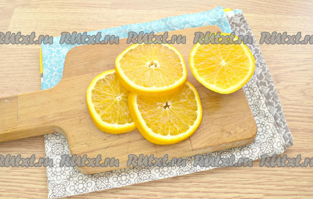 Апельсин также тщательно промываем и нарезаем на ломтики толщиной, примерно, 0,5-0,7 сантиметра. Косточки, если они есть, из ломтиков апельсина убираем.