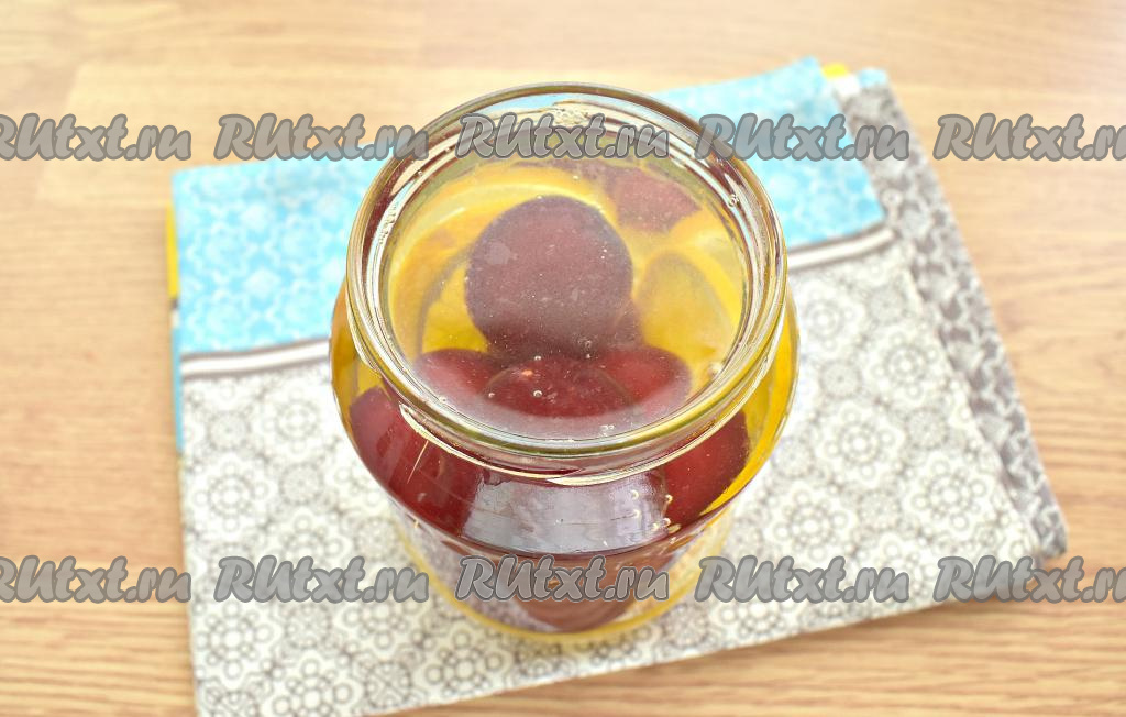 Банку с компотом из слив и апельсина ставим вверх дном, укрываем в одеяло (или плед) и полностью остужаем (обычно в течение суток).