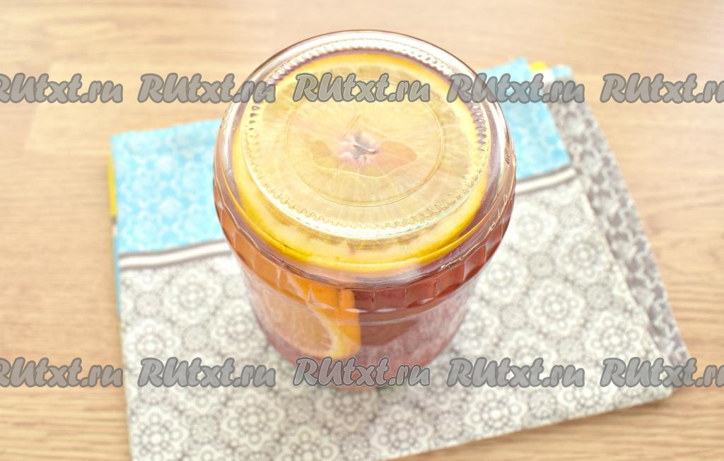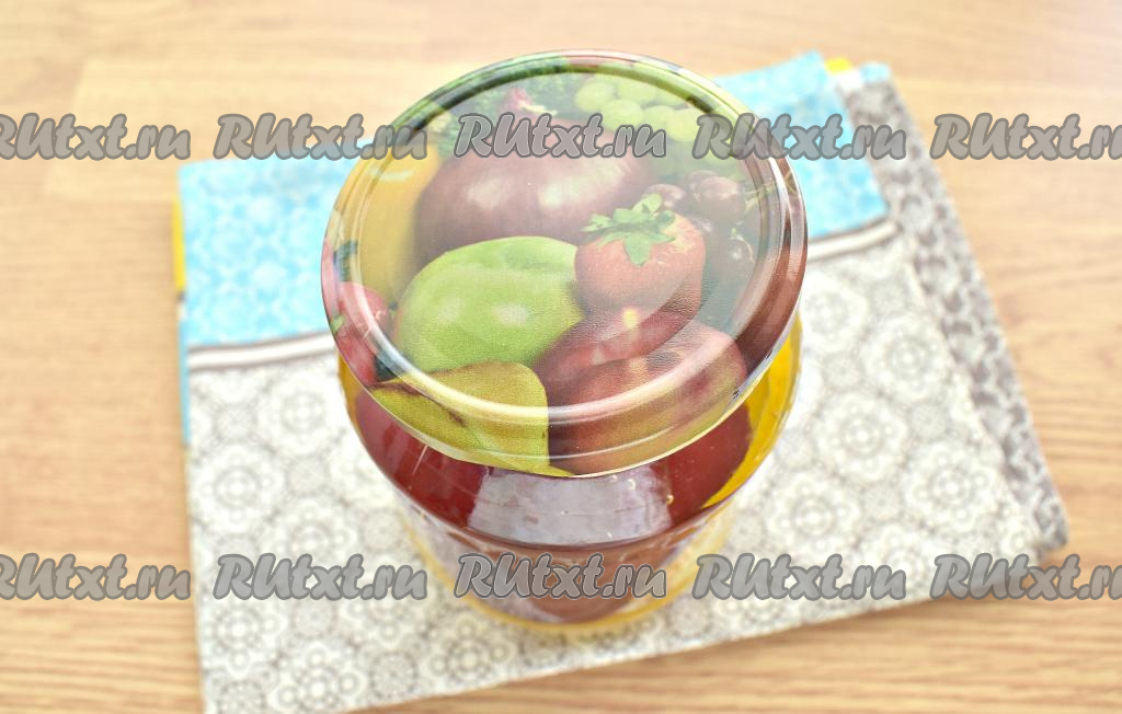 Сироп заливаем в банку. Закручиваем банку крышкой. Чтобы проверить герметичность закрутки, банку переворачиваем на бок и прокатываем по столу.
