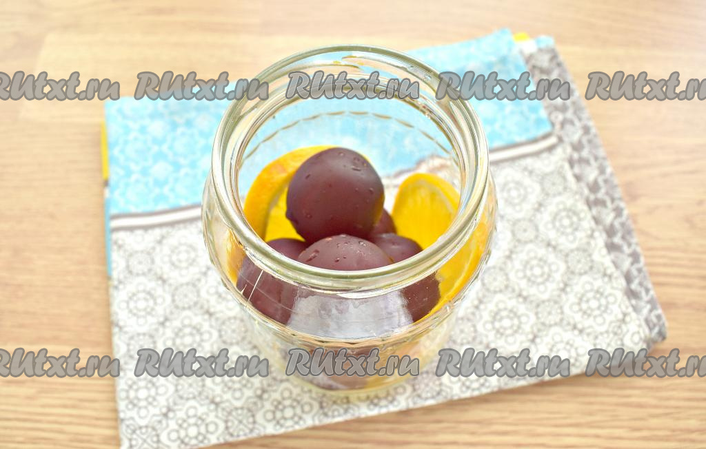 Сливы вместе с ломтиками апельсина перекладываем в простерилизованную банку (я взяла баночку объёмом 1 литр).