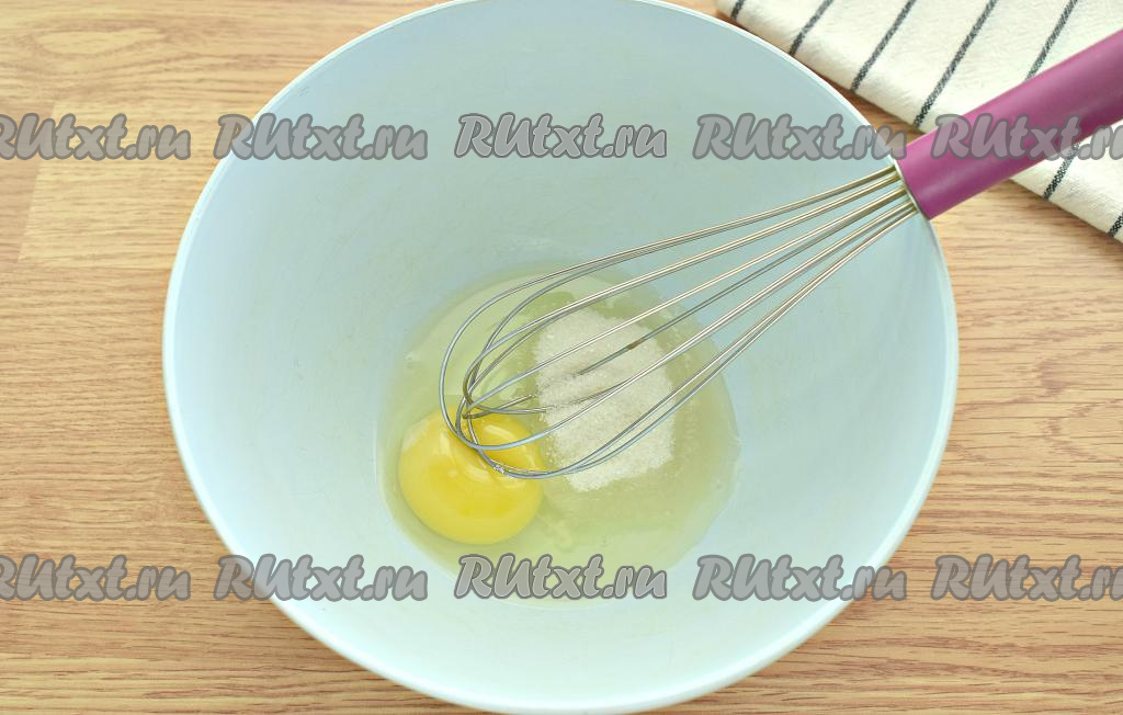 Чтобы творожное тесто получилось мягким, а сами пончики - нежными, творог я рекомендую протереть через сито. Ягоды вишни промываем, удаляем удобным способом косточки. В миску разбиваем яйцо, добавляем сахар. Ручным венчиком ингредиенты взбиваем в течение минуты (до получения однородной смеси).