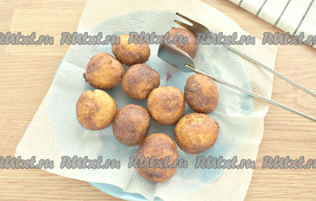 После жарки пончики из творога с вишней желательно выкладывать на бумажные салфетки, чтобы удалить лишнее масло.