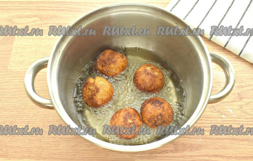 В небольшой кастрюльке разогреваем растительное масло. Выкладываем творожные пончики с вишней в раскалённое масло и жарим их, примерно, в течение 4 минут на среднем огне, переворачивая с одной стороны на другую.