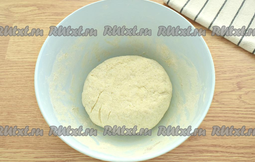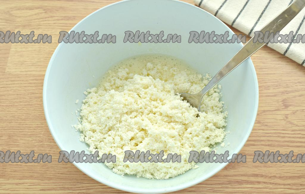 Замешиваем творожное тесто, которое должно быть по консистенции плотным и мягким. Муки, в зависимости от влажности творога, может потребоваться больше или меньше.