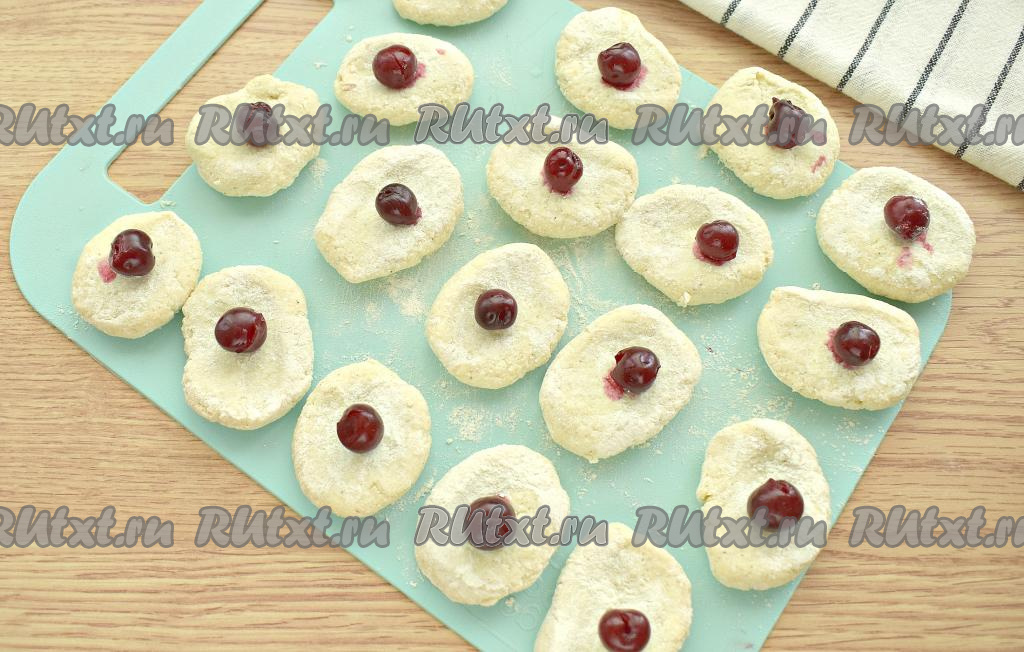Кусочки обваливаем в муке, прижимаем, формируя лепёшку. На каждую лепёшку кладём по ягодке вишни.