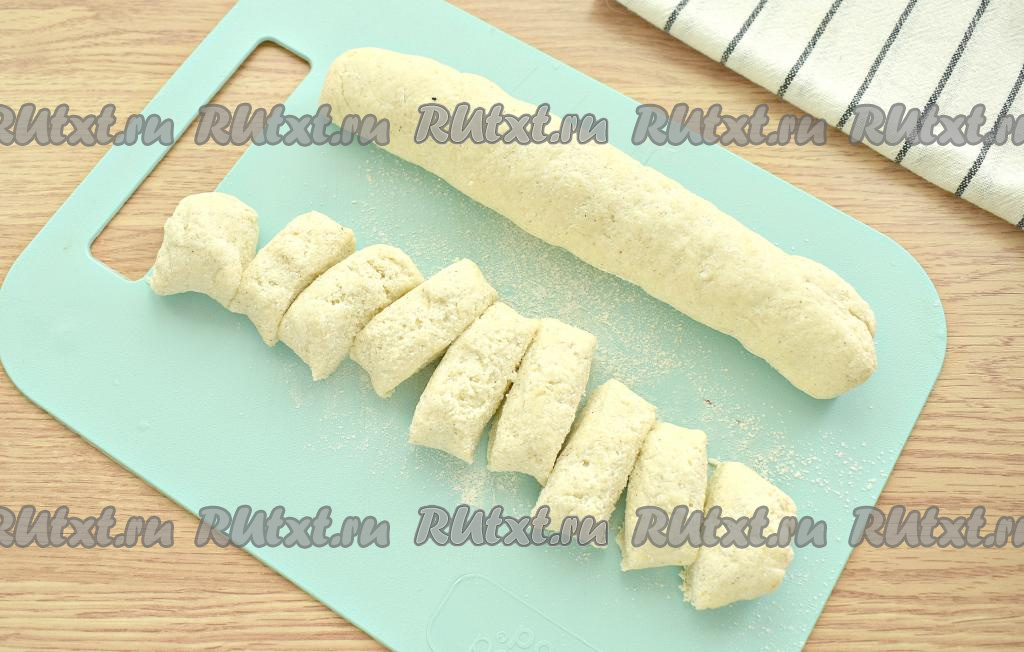 Тесто делим пополам, формируем две колбаски. Каждую колбаску разрезаем на 9 или 10 кусочков.