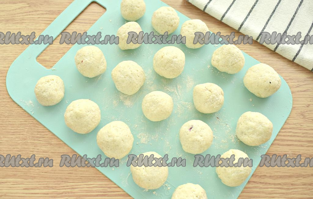 Края каждой лепёшки собираем над вишенкой, пряча начинку и формируя заготовку творожного пончика. Заготовки пончиков катаем в ладонях, придавая им форму шарика.