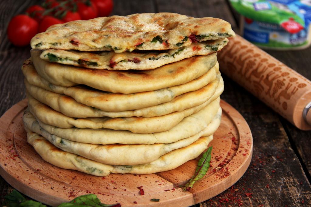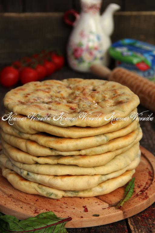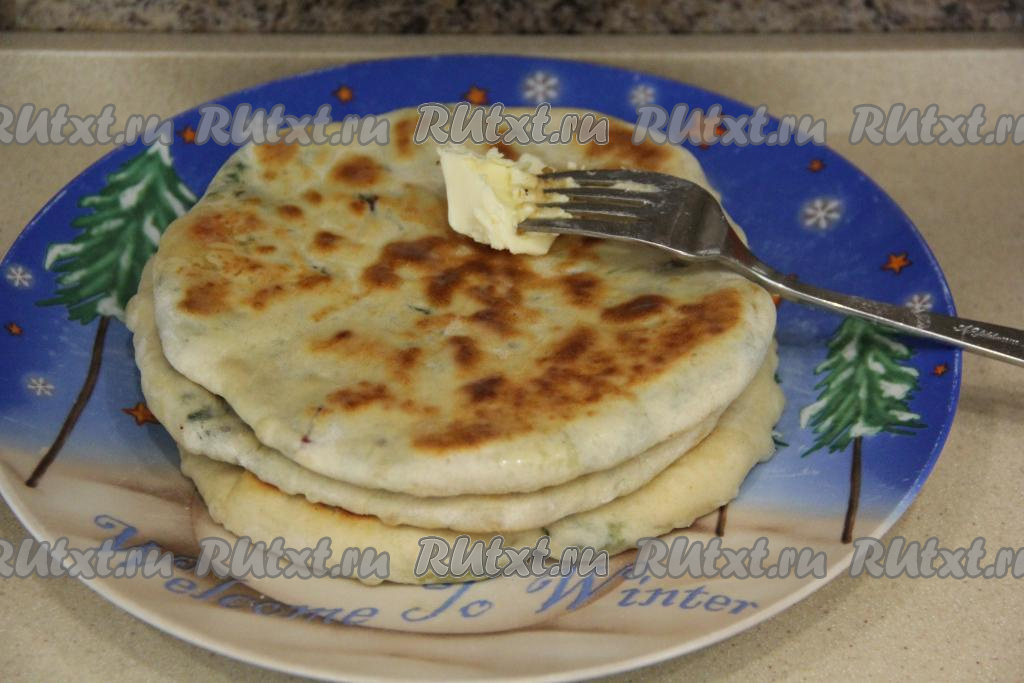 Готовую лепёшки переложить на тарелку и сразу смазать сливочным маслом. Постепенно пожарить все лепёшки, складывая их аппетитной стопочкой на тарелку и смазывая маслом.