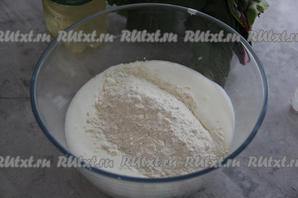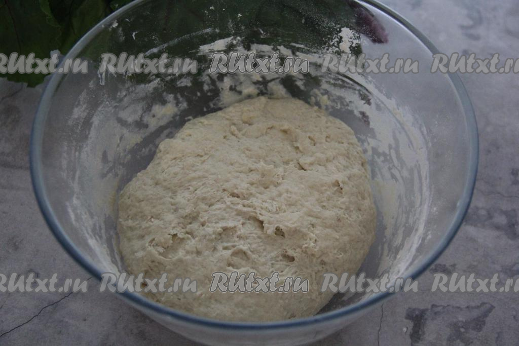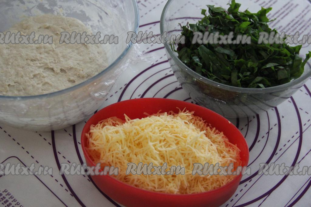 Оставить тесто для лепёшек в миске на 15-20 минут, затянув миску пищевой плёнкой (или прикрыв полотенцем). В это время можно заняться начинкой, для этого ботву свеклы нужно промыть под водой и обсушить, а затем нарезать достаточно мелко. Сыр натереть на мелкой тёрке.