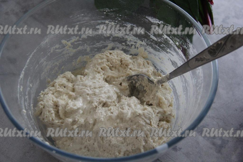 Перемешать кефирное тесто ложкой. Влить масло.
