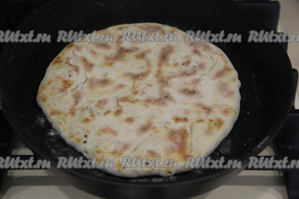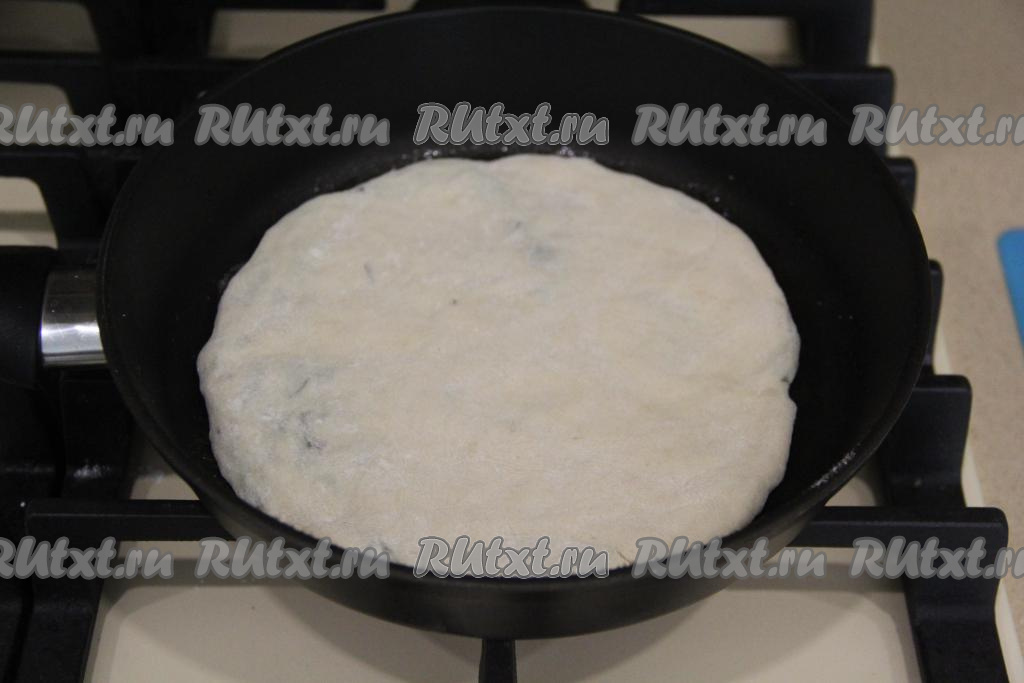 Аккуратно раскатать лепёшку с начинкой с помощью скалки. Размер лепёшки, примерно, 20 сантиметров. Сковороду хорошо разогреть и выложить лепёшку на сковороду.